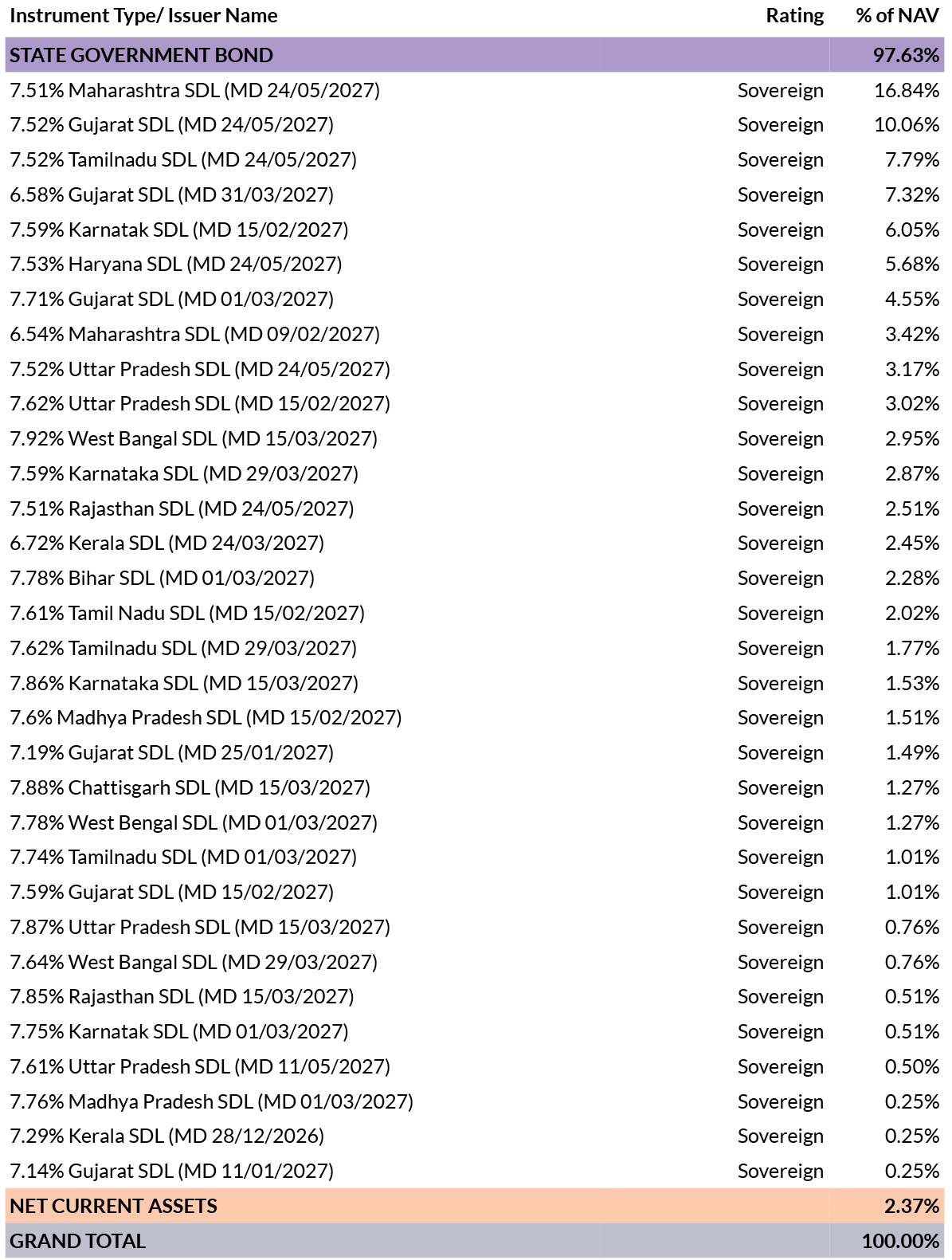 ![]() | RESIDUAL MATURITY | 3.61 years | MODIFIED DURATION* | 3.04 years | MACULARY DURATION* | 3.16 years | Annualised Portfolio YTM * | 7.46% |