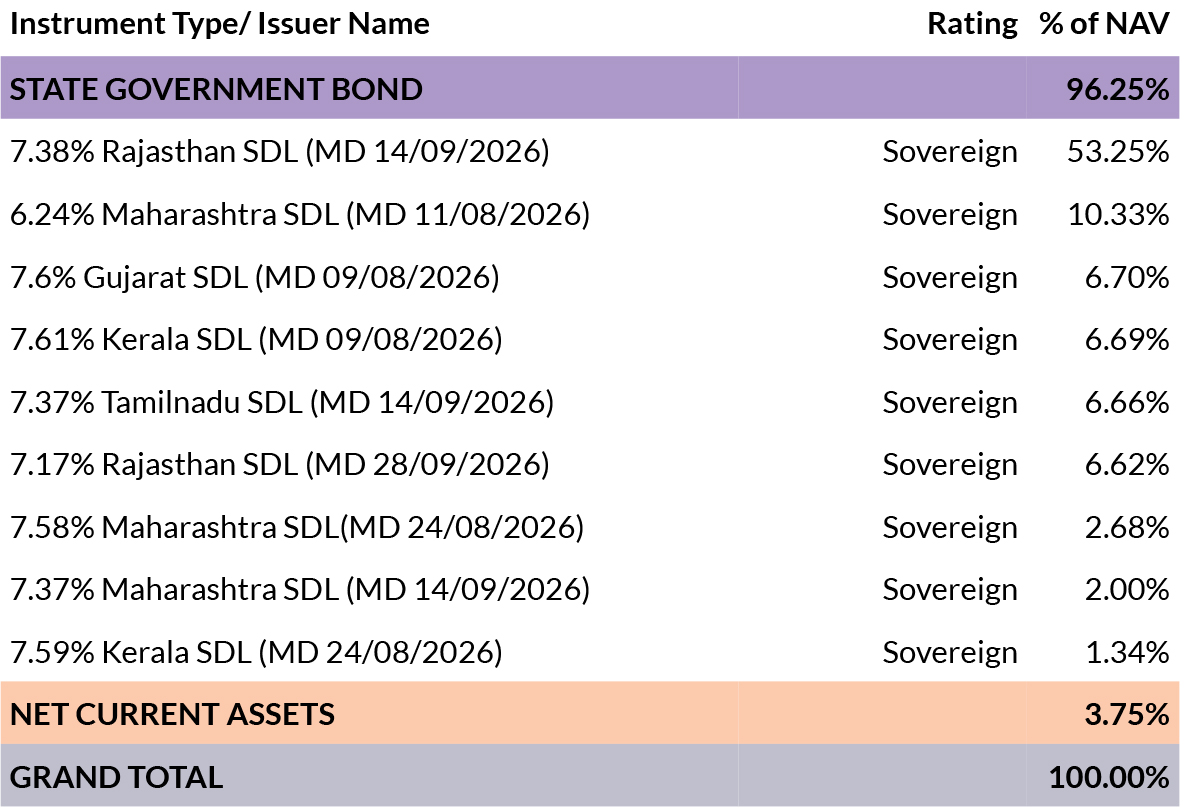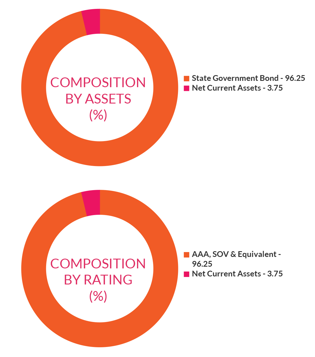 ![]() | RESIDUAL MATURITY | 2.99 years | MODIFIED DURATION* | 2.55 years | MACULARY DURATION* | 2.65 years | Annualised Portfolio YTM * | 7.44% |