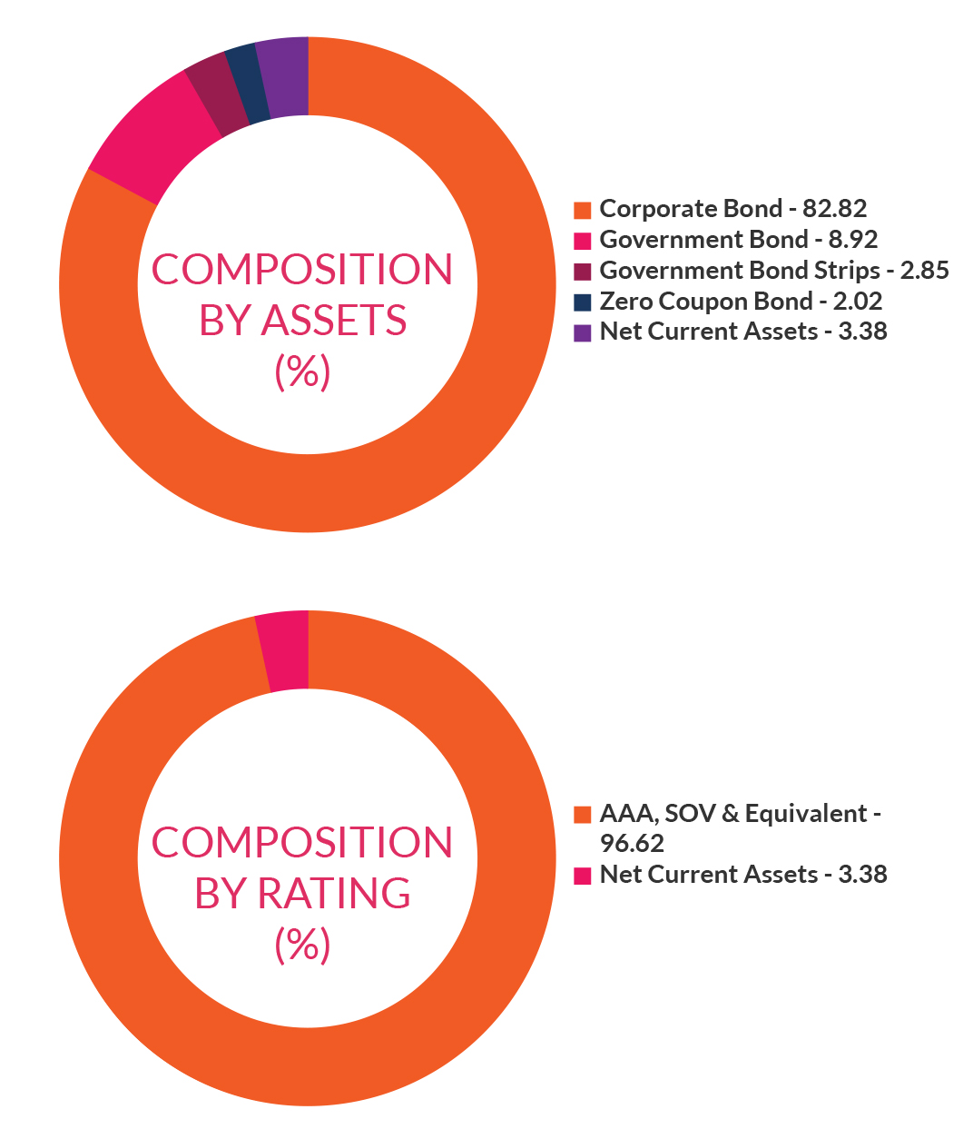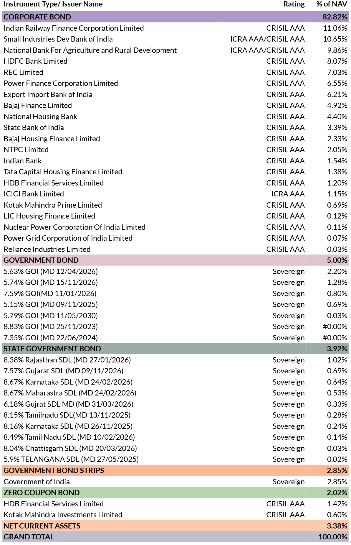 ![]() | RESIDUAL MATURITY | 2.8 years | MODIFIED DURATION* | 2.36 years | MACULARY DURATION* | 2.52 years | Annualised Portfolio YTM* | 7.47% *in case of semi annual YTM, it will be annualised |