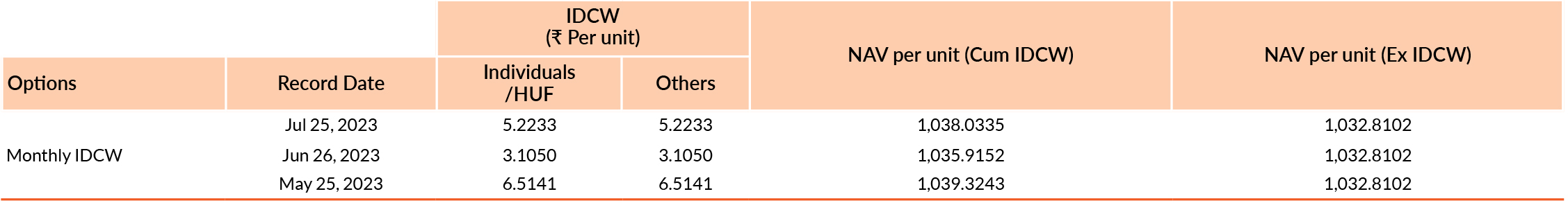 Pursuant to payment of Distribution (of Income & Capital), the NAV of the above stated IDCW options of the scheme/plan would fall to the extent of payout and statutory levy, if any. Past performance may or may not be sustained in future. Face value of units is ₹1000. IDCW means Income Distribution cum Capital Withdrawal.