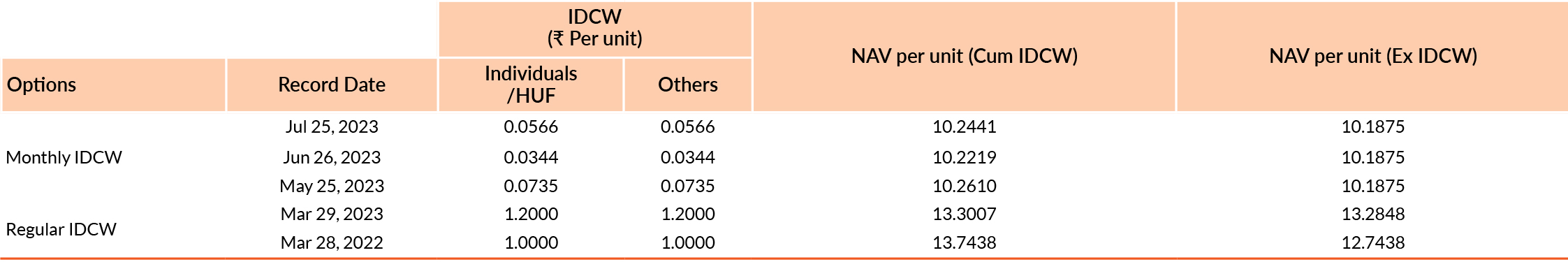 Pursuant to payment of Distribution (of Income & Capital), the NAV of the above stated IDCW options of the scheme/plan would fall to the extent of payout and statutory levy, if any. Past performance may or may not be sustained in future. Face value of units is ₹10. IDCW means Income Distribution cum Capital Withdrawal.