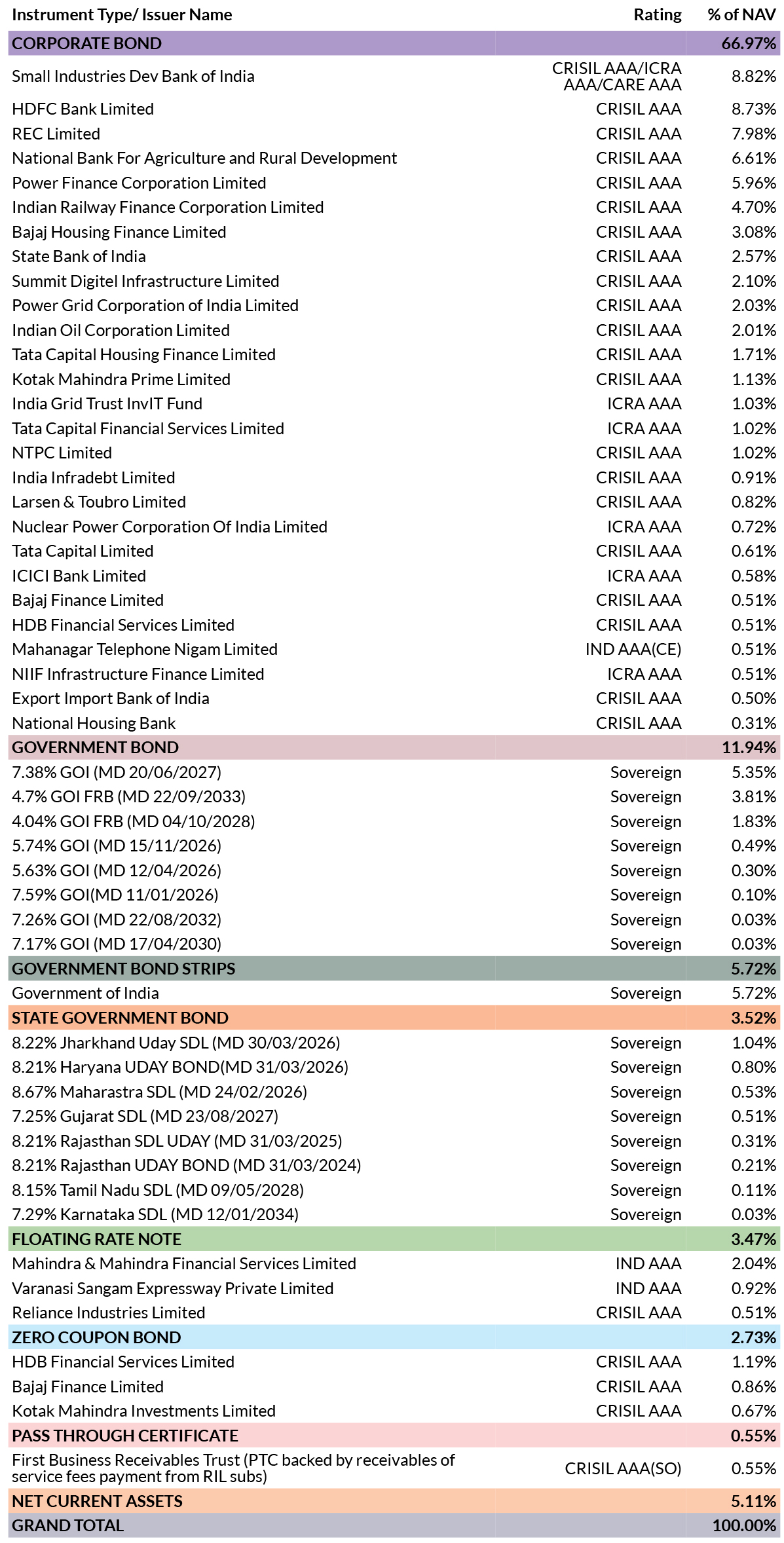 ![]() | Residual Maturity* | 3.66 years | Modified Duration* | 2.6 years | Macaulay Duration* | 2.76 years | Annualised Portfolio YTM* | 7.54% | *in case of semi annual YTM, it will be annualised |