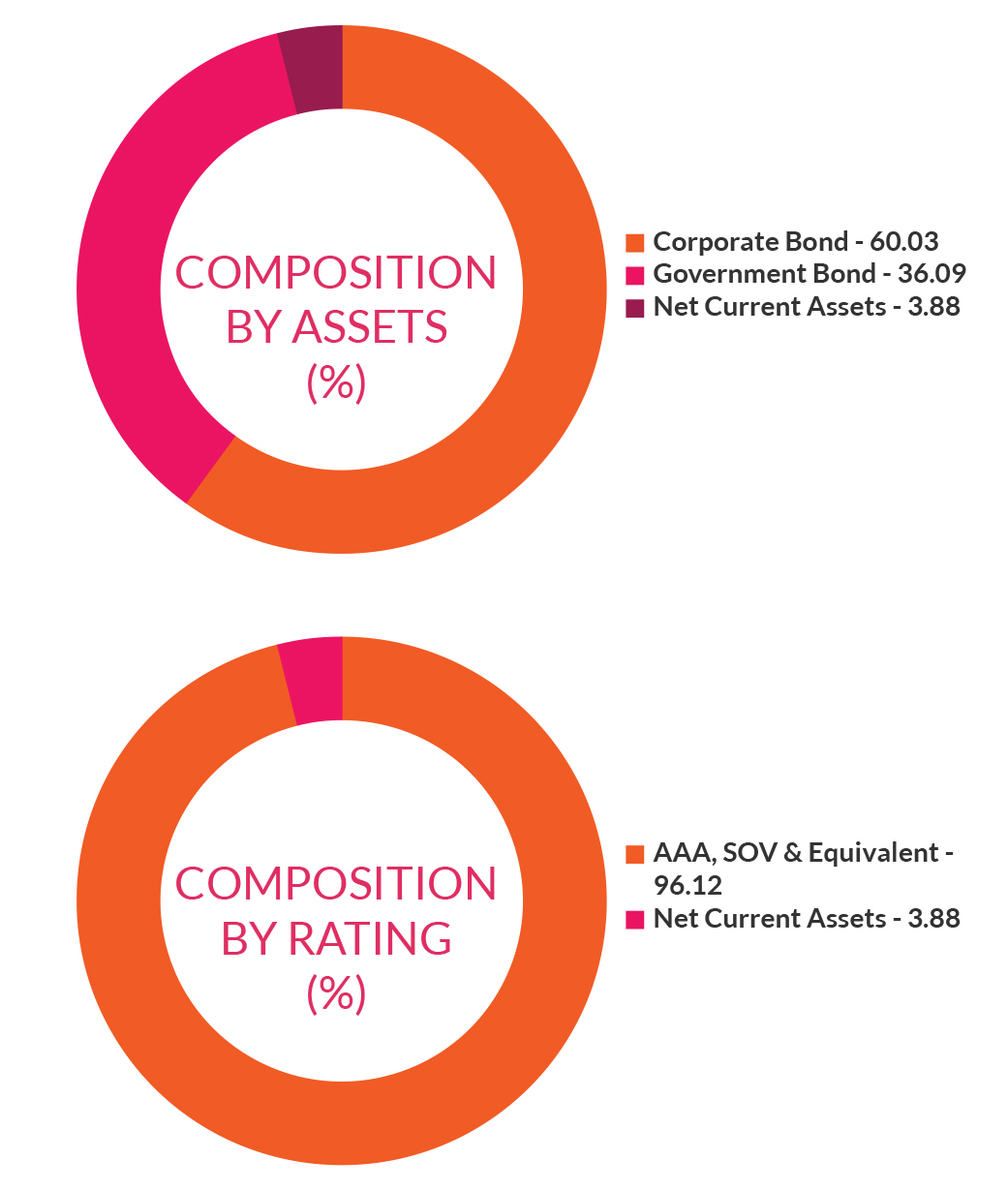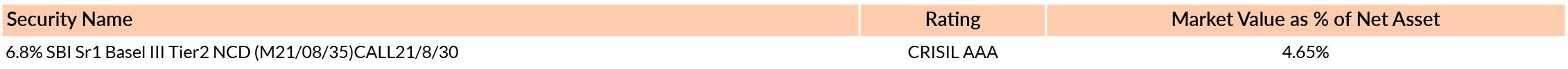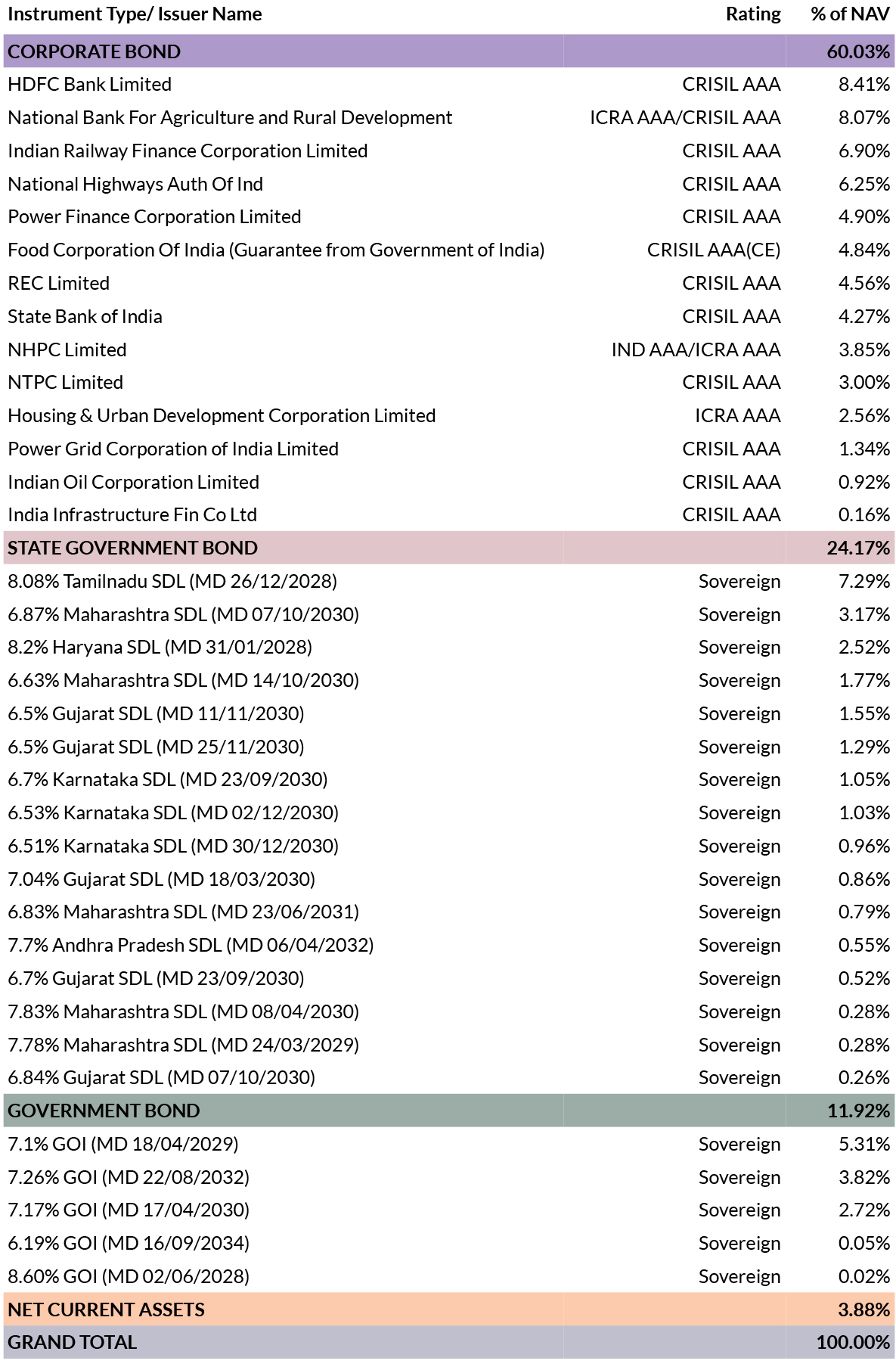 ![]() | RESIDUAL MATURITY* | 6.57 years | MODIFIED DURATION* | 4.85 years | MACULARY DURATION* | 5.12 years | Annualised Portfolio YTM* | 7.46% |