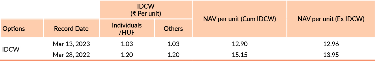 Pursuant to payment of Distribution (of Income & Capital), the NAV of the above stated IDCW options of the scheme/plan would fall to the extent of payout and statutory levy, if any. Past performance may or may not be sustained in future. Face value of units is ₹ 10. IDCW means Income Distribution cum Capital Withdrawal.