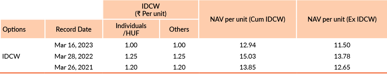 Pursuant to payment of Distribution (of Income & Capital), the NAV of the above stated IDCW options of the scheme/plan would fall to the extent of payout and statutory levy, if any. Past performance may or may not be sustained in future. Face value of units is ₹ 10. IDCW means Income Distribution cum Capital Withdrawal.