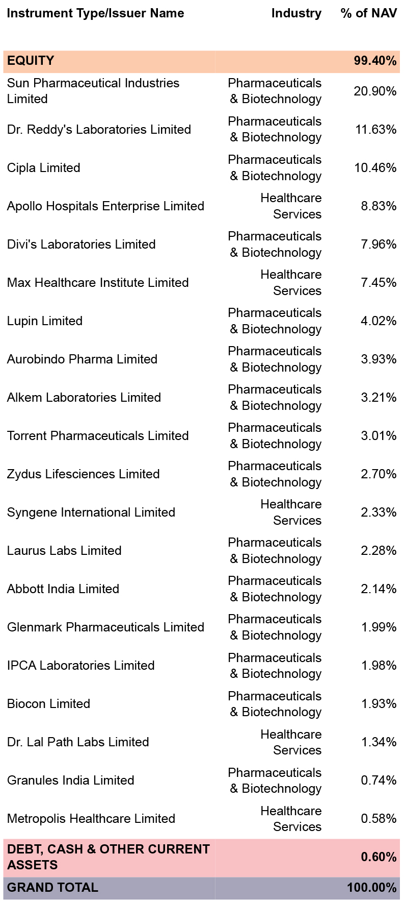 The investment objective of the Scheme is to provide returns before expenses that closely correspond to the total returns of the NIFTY Healthcare Index subject to tracking errors. However, there is no assurance or guarantee that the investment objective of the scheme will be achieved.
