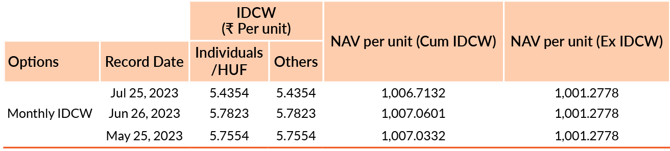 Pursuant to payment of Distribution (of Income & Capital), the NAV of the above stated IDCW options of the scheme/plan would fall to the extent of payout and statutory levy, if any. Past performance may or may not be sustained in future. Face value of units is ₹ 1000. IDCW means Income Distribution cum Capital Withdrawal.
