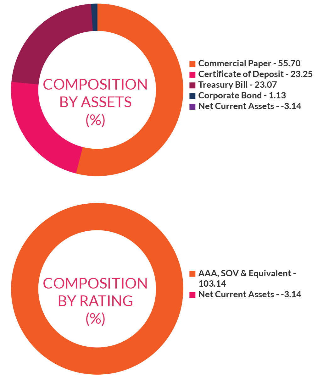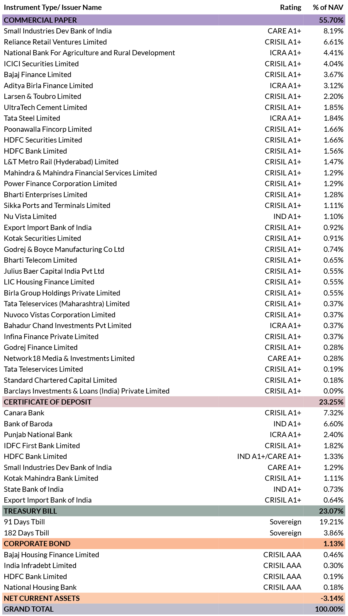 ![]() | Residual Maturity | 41 days | Modified Duration* | 41 days | Macaulay Duration* | 41 days | Annualised Portfolio YTM* | 6.90% | *in case of semi annual YTM, it will be annualised |