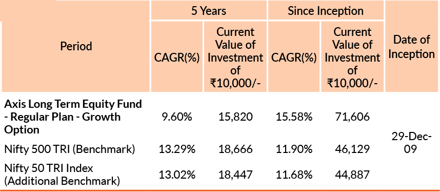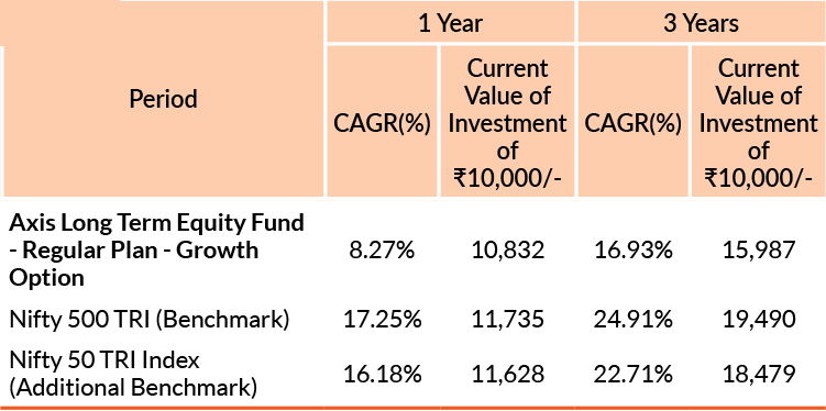 Past performance may or may not be sustained in future.Different plans have different expense structure. Jinesh Gopani is managing the scheme since 1st April 2011 and he manages 10 schemes of Axis Mutual Fund . Please refer to annexure for performance of all schemes managed by the fund manager. Returns greater than 1 year period are compounded annualised (CAGR). Face Value per unit : ₹ 10.