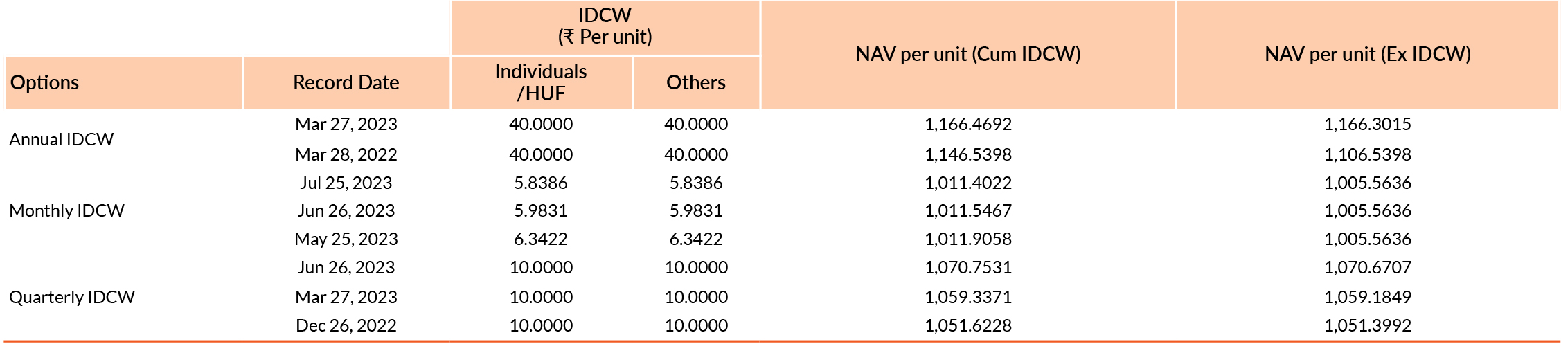Pursuant to payment of Distribution (of Income & Capital), the NAV of the above stated IDCW options of the scheme/plan would fall to the extent of payout and statutory levy, if any. Past performance may or may not be sustained in future. Face value of units is ₹1000. IDCW means Income Distribution cum Capital Withdrawal.