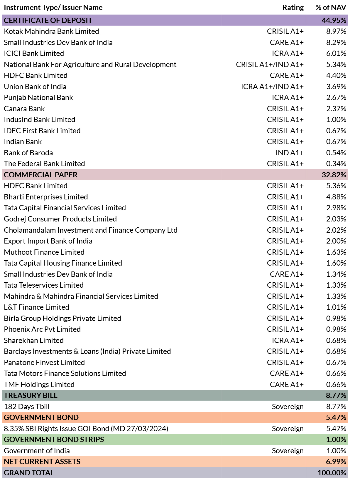 ![]() | Residual Maturity* | 200 days | Modified Duration* | 199 days | Macaulay Duration* | 200 days | Annualised Portfolio YTM* | 7.22% | *in case of semi annual YTM, it will be annualised |