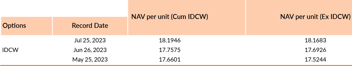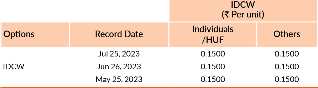 Pursuant to payment of Distribution (of Income & Capital), the NAV of the above stated IDCW options of the scheme/plan would fall to the extent of payout and statutory levy, if any. Past performance may or may not be sustained in future. Face value of units is ₹ 10. IDCW means Income Distribution cum Capital Withdrawal.