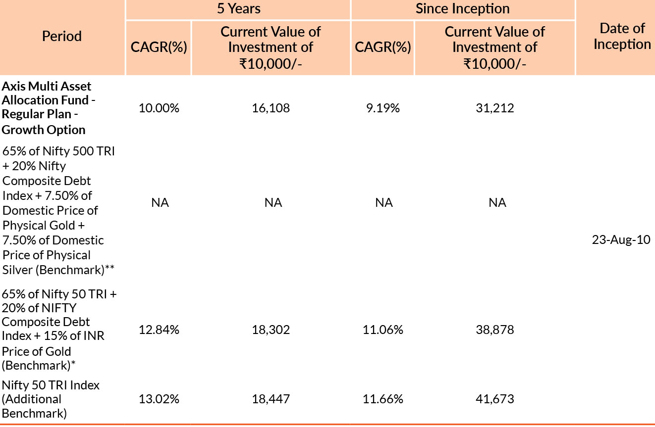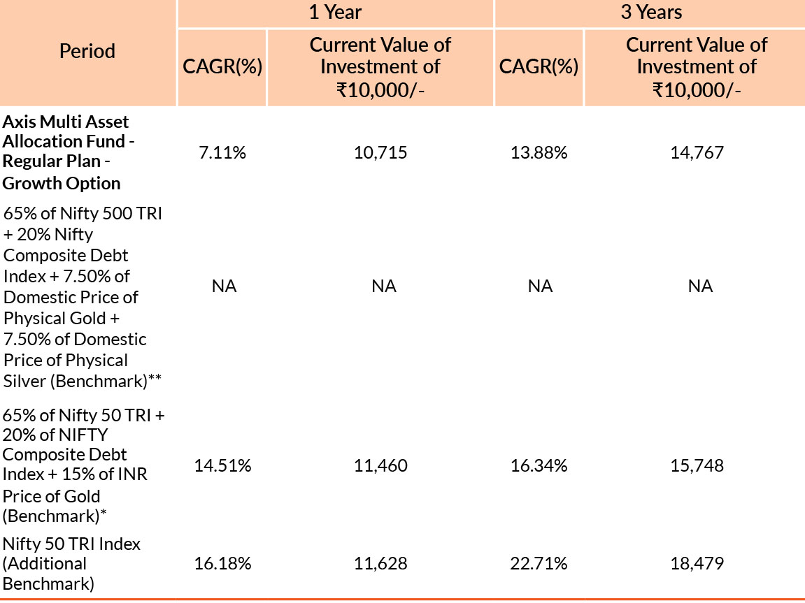 **The benchmark of Axis Multi Asset Allocation Fund is Nifty 500 TRI Index (65%) + Nifty Composite Debt Index (20%) + Domestic Price of Physical Gold (7.5%) + Domestic Price of Physical Silver (7.5%)