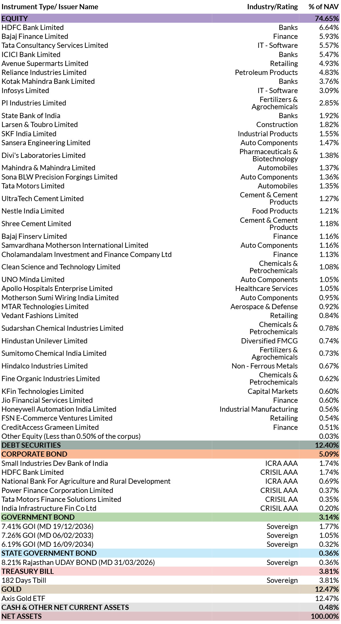 BENCHMARK | 65% of Nifty 500 TRI + 20% Nifty Composite Debt Index + 7.50% of Domestic Price of Physical Gold + 7.50% of Domestic Price of Physical Silver |