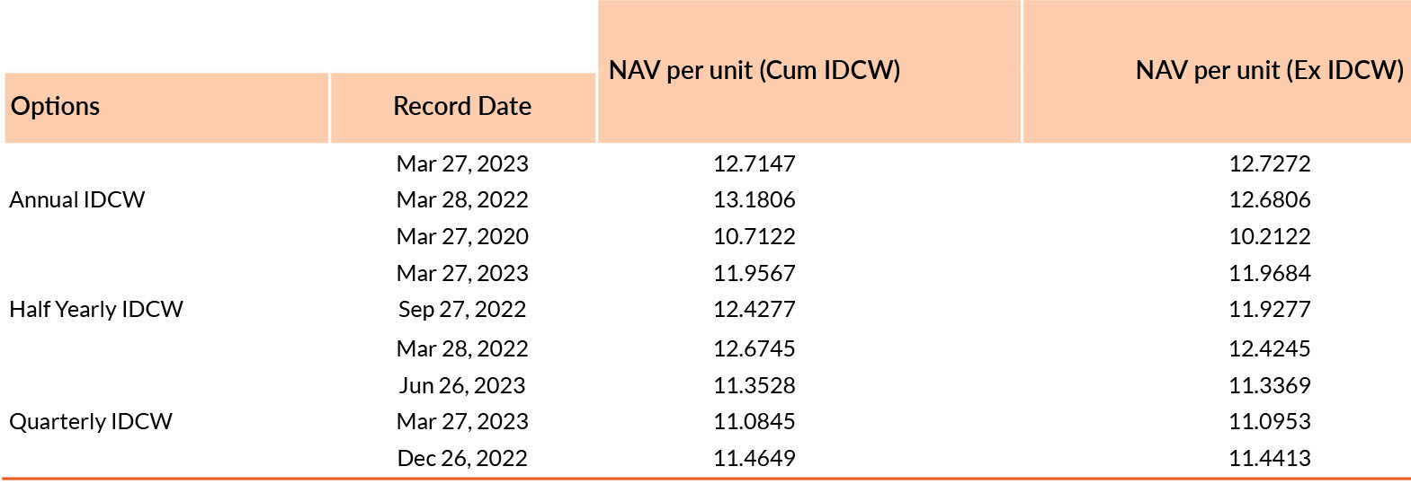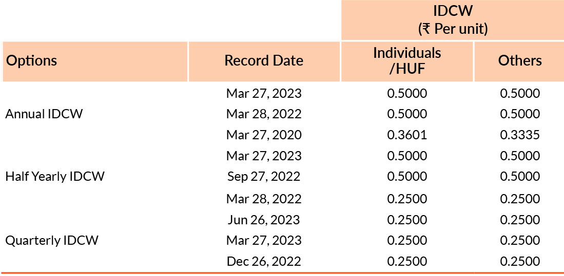 Pursuant to payment of Distribution (of Income & Capital), the NAV of the above stated IDCW options of the scheme/plan would fall to the extent of payout and statutory levy, if any. Past performance may or may not be sustained in future. Face value of units is ₹ 10. IDCW means Income Distribution cum Capital Withdrawal.