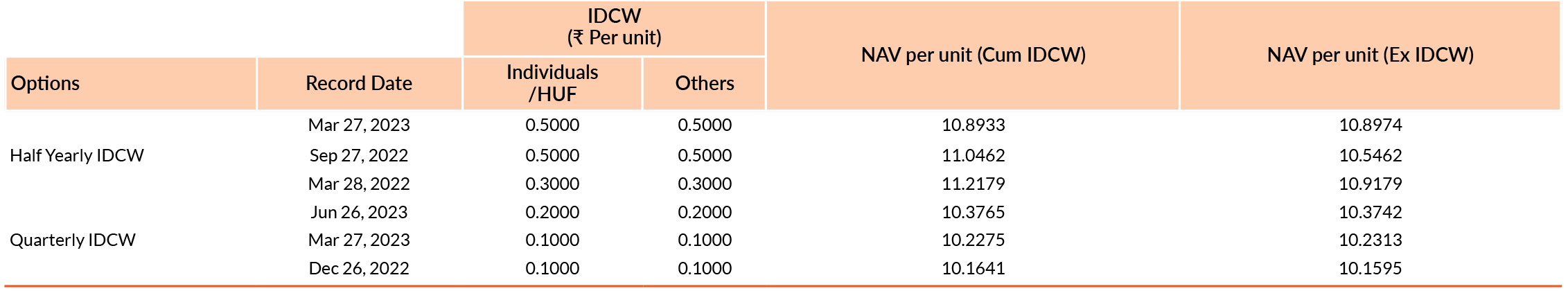 Pursuant to payment of Distribution (of Income & Capital), the NAV of the above stated IDCW options of the scheme/plan would fall to the extent of payout and statutory levy, if any. Past performance may or may not be sustained in future. Face value of units is ₹10. IDCW means Income Distribution cum Capital Withdrawal.