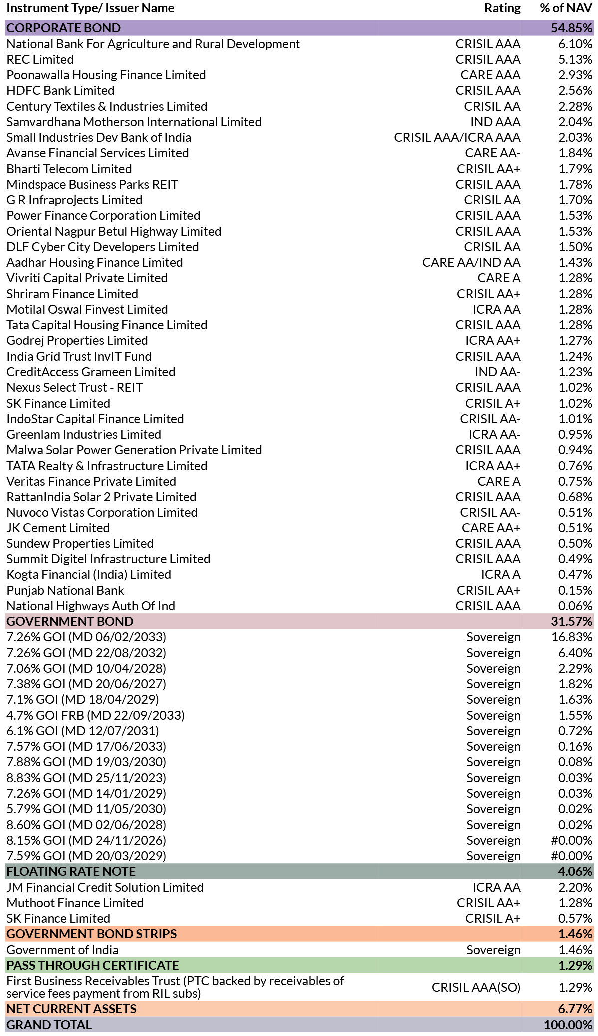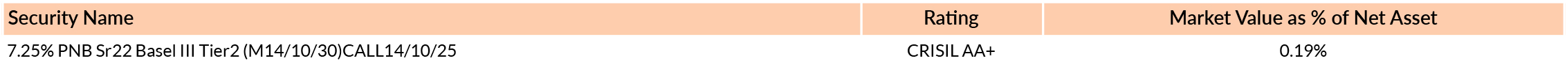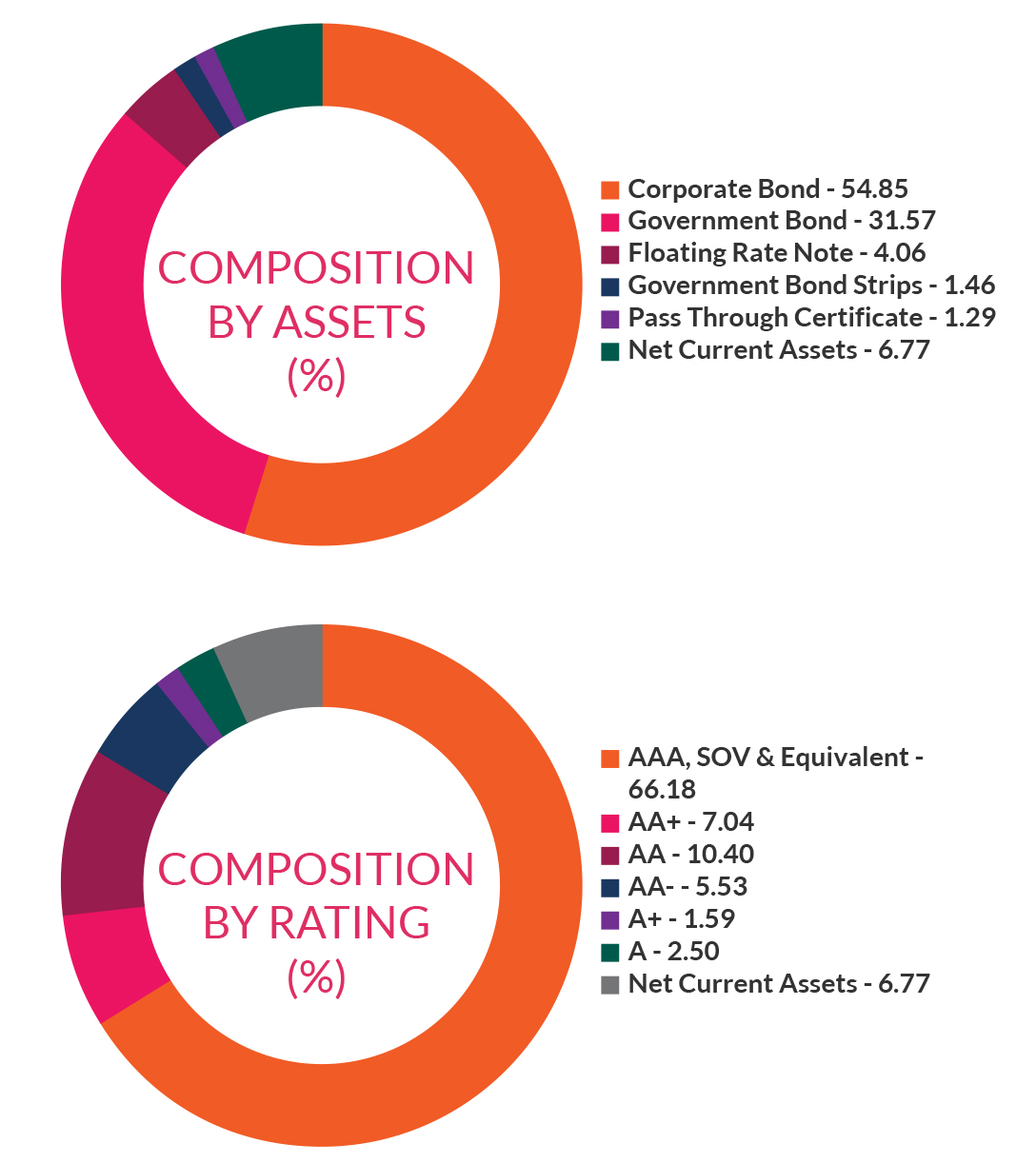 *in case of semi annual YTM, it will be annualised *As per AMFI Best Practices Guidelines Circular No. 88 / 2020 -21-Additional Disclosures in Monthly Factsheets. For instruments with put/call option, the put/call date has been taken as the maturity date. & The yield to maturity given above is based on the portfolio of funds as on date given above. This should not be taken as an indication of the returns that maybe generated by the fund and the securities bought by the fund may or may not be held till their respective maturities. The calculation is based on the invested corpus of the debt portfolio. |