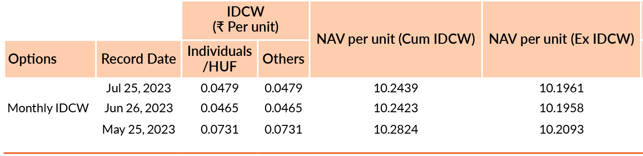 Pursuant to payment of Distribution (of Income & Capital), the NAV of the above stated IDCW options of the scheme/plan would fall to the extent of payout and statutory levy, if any. Past performance may or may not be sustained in future. Face value of units is ₹10. IDCW means Income Distribution cum Capital Withdrawal.