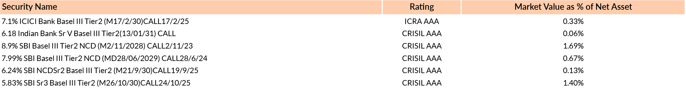 *As per AMFI Best Practices Guidelines Circular No. 88 / 2020 -21-Additional Disclosures in Monthly Factsheets. For instruments with put/call option, the put/call date has been taken as the maturity date. & The yield to maturity given above is based on the portfolio of funds as on date given above. This should not be taken as an indication of the returns that maybe generated by the fund and the securities bought by the fund may or may not be held till their respective maturities. The calculation is based on the invested corpus of the debt portfolio. | ||