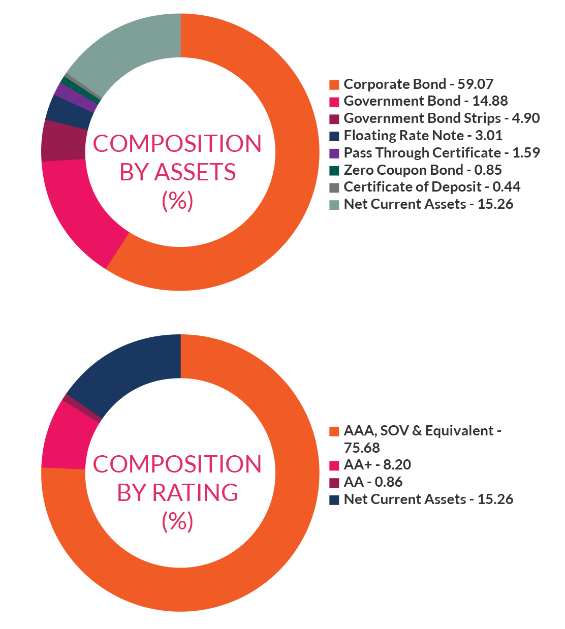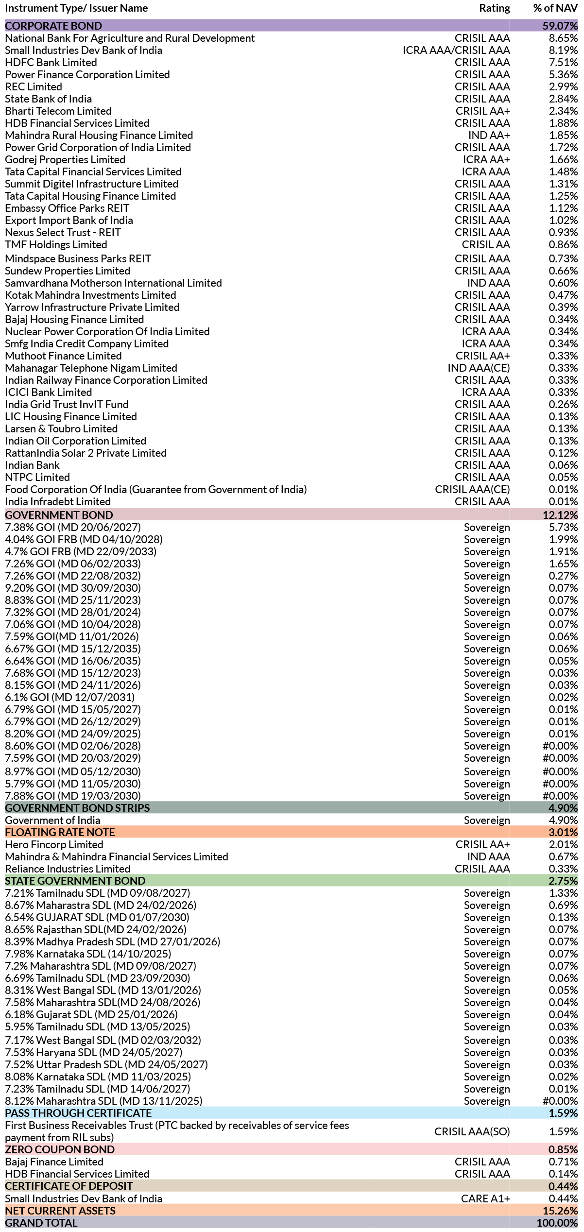 ![]() | RESIDUAL MATURITY | 3.42 years | MODIFIED DURATION* | 2.52 years | MACULARY DURATION* | 2.67 years | Annualised Portfolio YTM* | 7.49% *in case of semi annual YTM, it will be annualised |