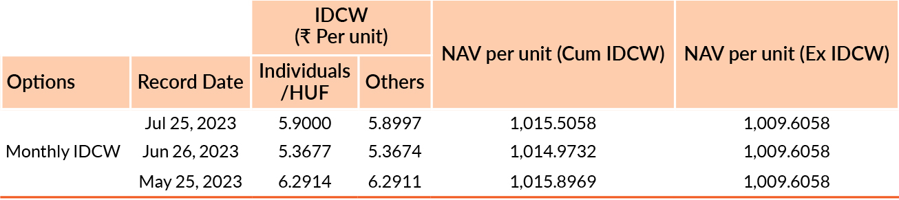 Pursuant to payment of Distribution (of Income & Capital), the NAV of the above stated IDCW options of the scheme/plan would fall to the extent of payout and statutory levy, if any. Past performance may or may not be sustained in future. Face value of units is ₹1000. IDCW means Income Distribution cum Capital Withdrawal.