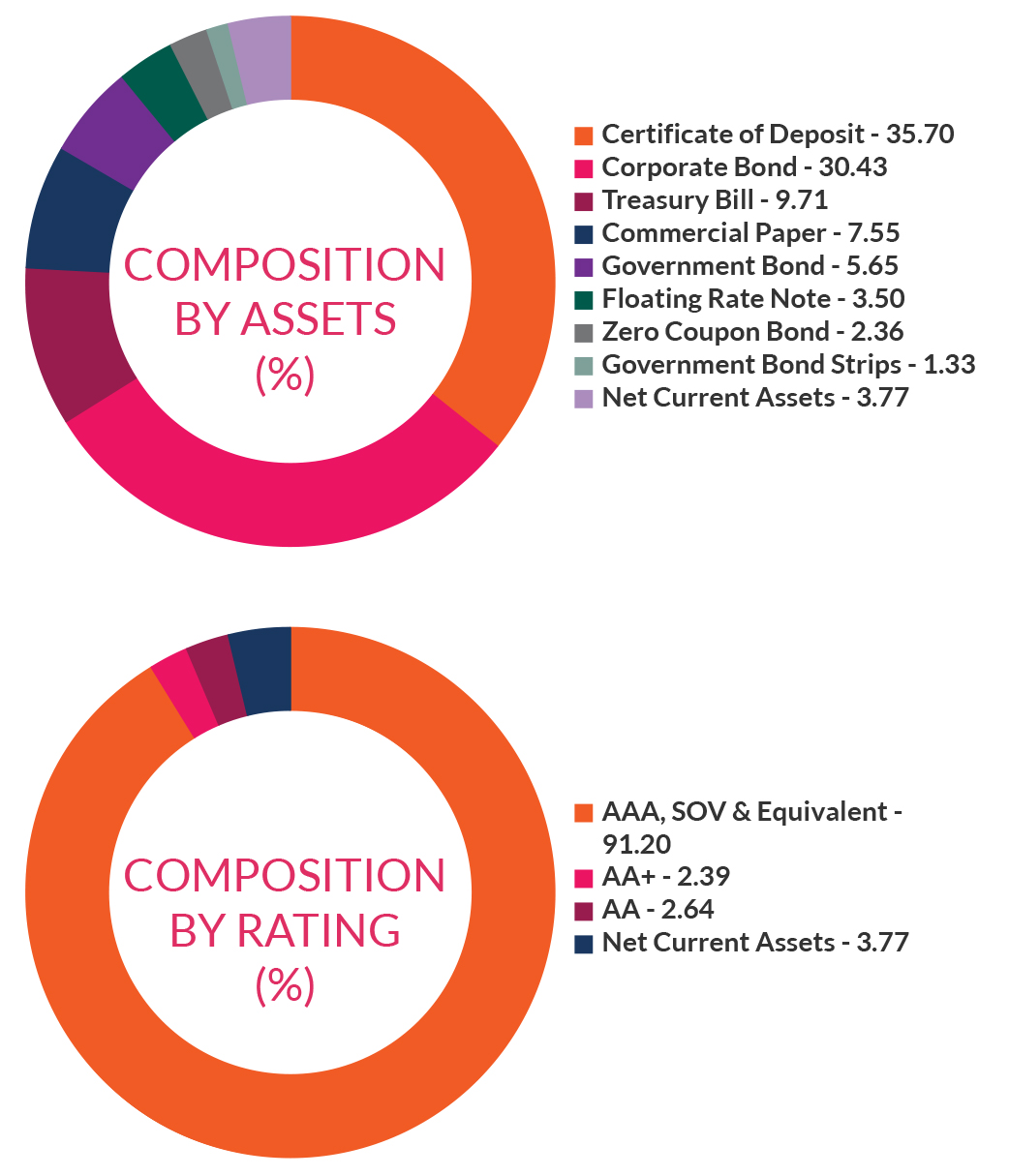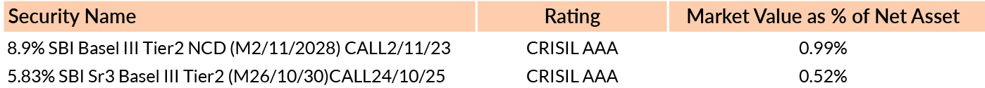 * As per AMFI Best Practice Guidelines Circular No. 88/2020-21-Additional Disclosures in Monthly Factsheets. For instruments with put/call option, the put/call date has been taken as the maturity date. & The yield to maturity given above is based on the portfolio of funds as on date given above. This should not be taken as an indication of the returns that maybe generated by the fund and the securities bought by the fund may or may not be held till their respective maturities. The calculation is based on the invested corpus of the debt portfolio. | ||