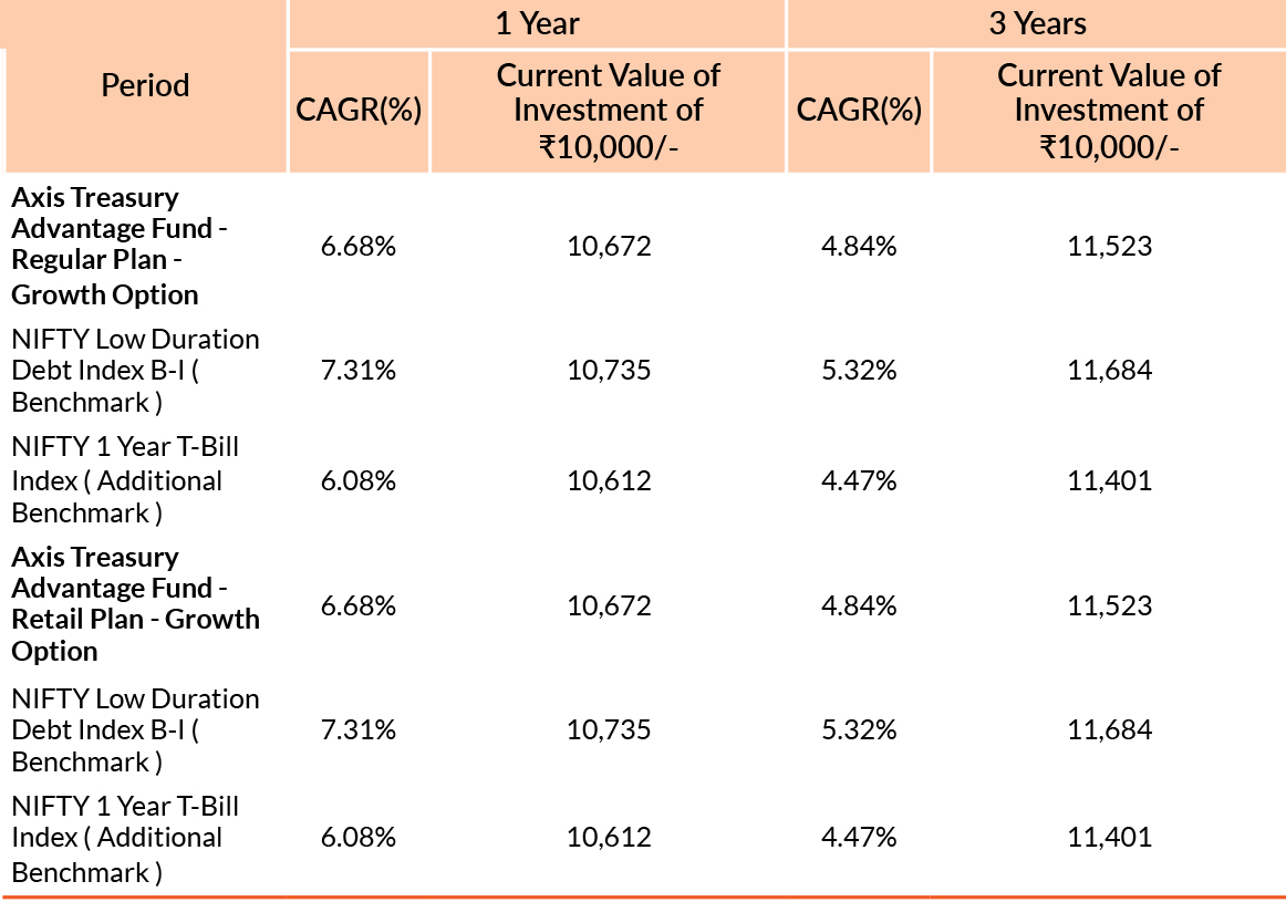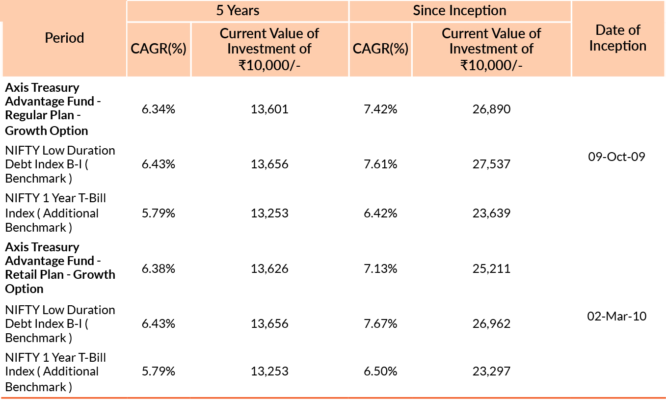 Past performance may or may not be sustained in future. Different plans have different expense structure. Devang Shah is managing the scheme since 7th June 2016 and he manages 14 schemes of Axis Mutual Fund & Aditya Pagaria is managing the scheme since 13th August 2016 and he manages 17 schemes of Axis Mutual Fund . Please refer to annexure for performance of all schemes managed by the fund manager. Returns greater than 1 year period are compounded annualised (CAGR). Face Value per unit : ₹ 1,000.