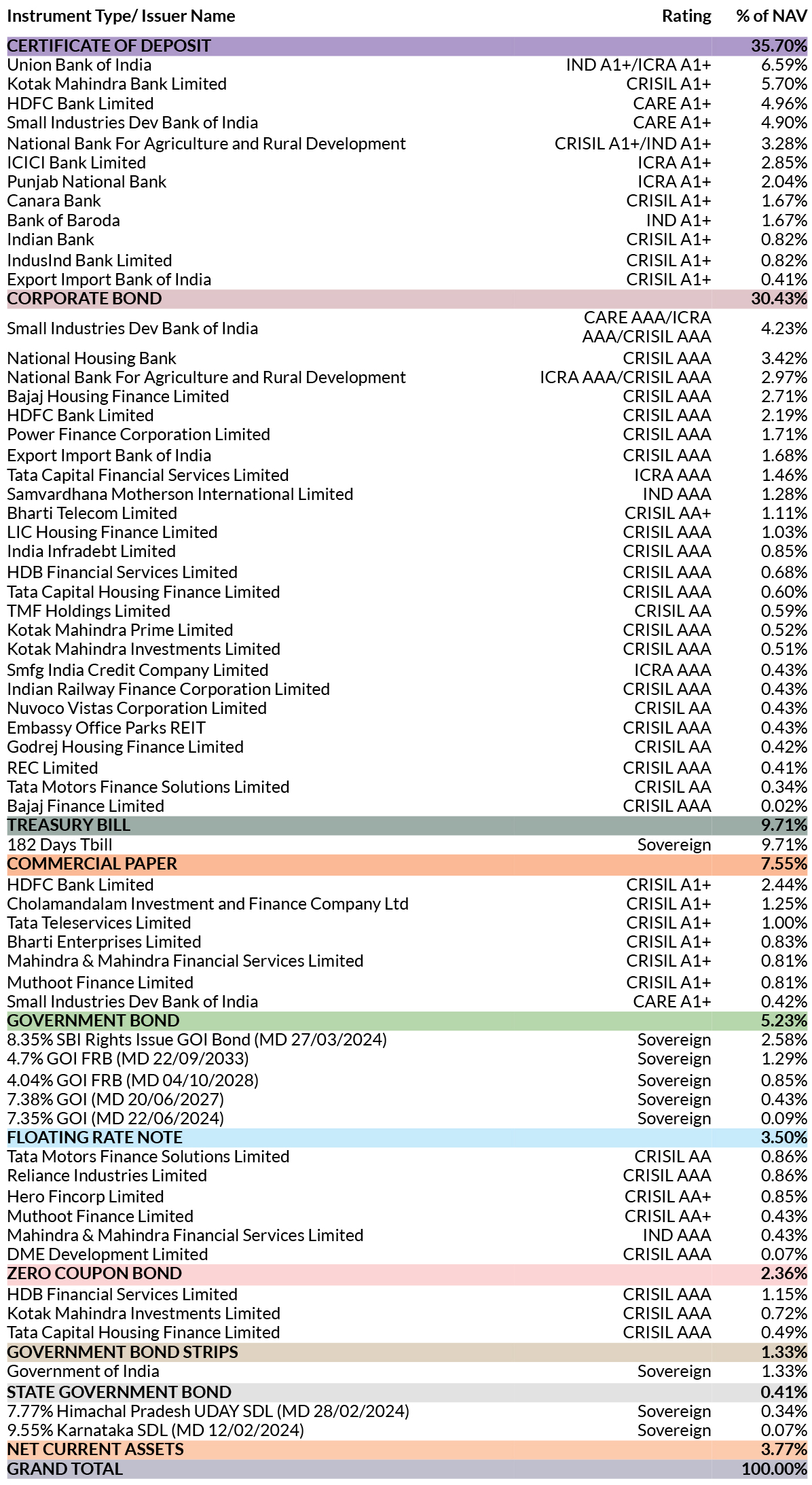 ![]() | Residual Maturity* | 422 days | Modified Duration* | 324 days | Macaulay Duration* | 340 days | Annualised Portfolio YTM* | 7.31% | *in case of semi annual YTM, it will be annualised |