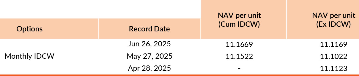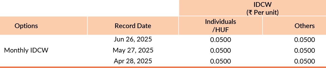 Pursuant to payment of Distribution (of Income & Capital), the NAV of the above stated IDCW options of the scheme/plan would fall to the extent of payout and statutory levy, if any. Past performance may or may not be sustained in future. Face value of units is ₹ 10. IDCW means Income Distribution cum Capital Withdrawal.