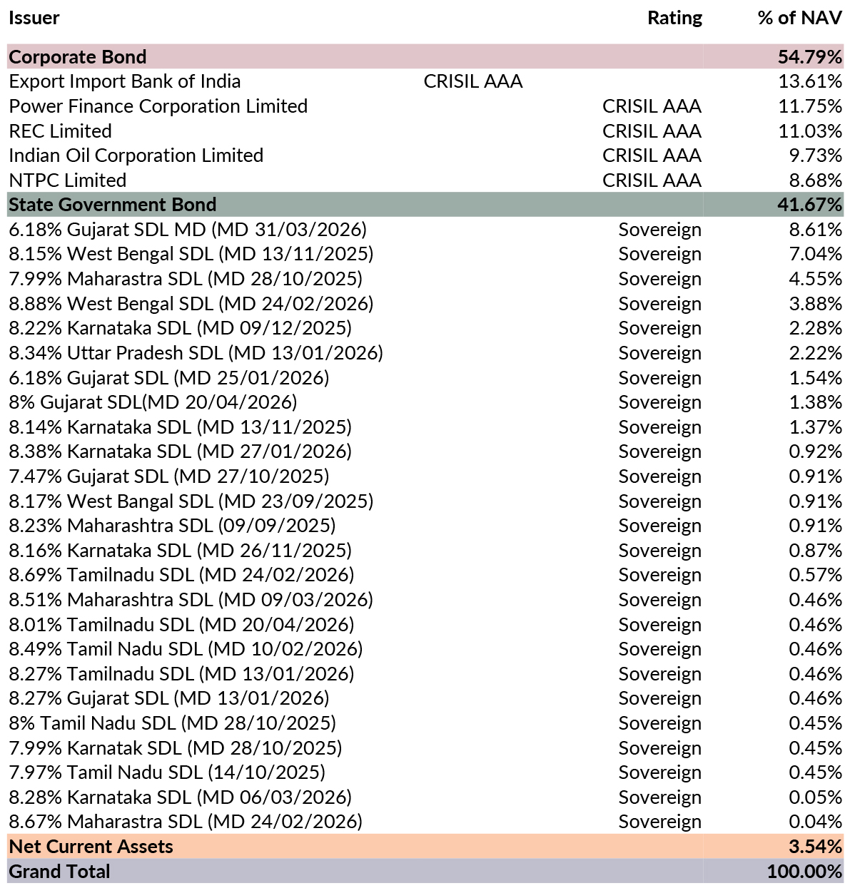 ![]() | RESIDUAL MATURITY | 0.4 years | MODIFIED DURATION* | 0.37 years | MACAULAY DURATION* | 0.39 years | Annualised Portfolio YTM * | 5.92% |