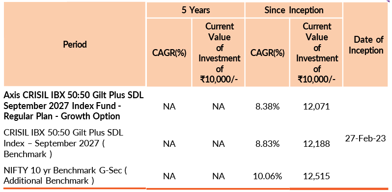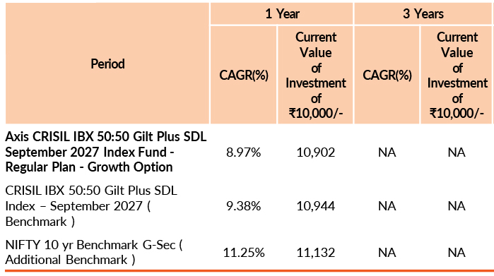 Axis CRISIL IBX 50:50 Gilt Plus SDL September 2027 Index Fund | 30-Jun-2025 | -0.41 | -- | -- | -- | -0.45 |