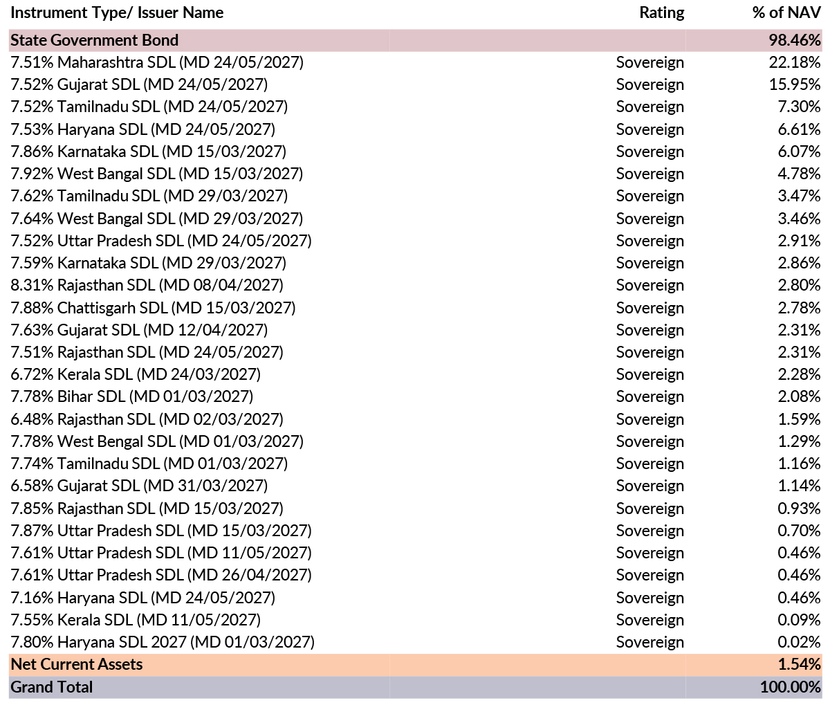 ![]() | RESIDUAL MATURITY | 1.8 years | MODIFIED DURATION* | 1.64 years | MACAULAY DURATION* | 1.69 years | Annualised Portfolio YTM * | 6.06% |