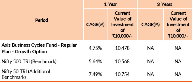 Past performance may or may not be sustained in future.Different plans have different expense structure. Ashish Naik is managing the scheme since 22nd February 2023 and he manages 4 schemes of Axis Mutual Fund .Please refer to annexure for performance of all schemes managed by the fund manager. Returns greater than 1 year period are compounded annualised (CAGR). Face Value per unit : ₹ 10.