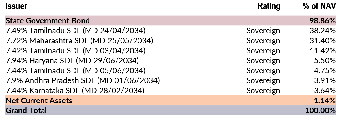 ![]() | RESIDUAL MATURITY | 8.76 years | MODIFIED DURATION* | 6.31 years | MACAULAY DURATION* | 6.53 years | Annualised Portfolio YTM * | 6.73% |