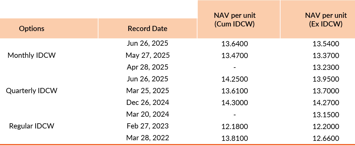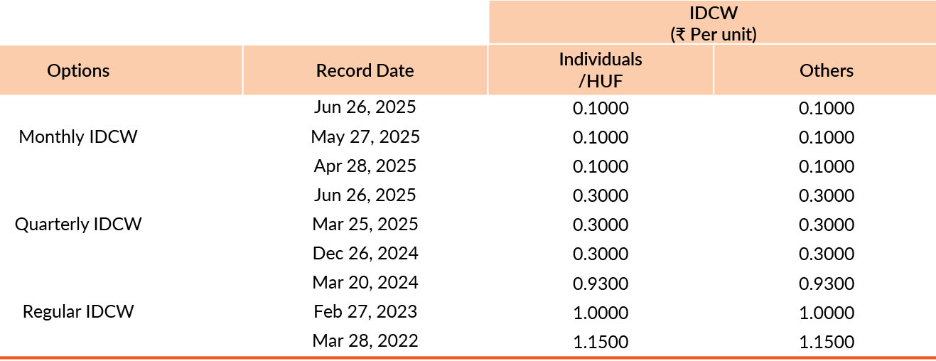 Pursuant to payment of Distribution (of Income & Capital), the NAV of the above stated IDCW options of the scheme/plan would fall to the extent of payout and statutory levy, if any. Past performance may or may not be sustained in future. Face value of units is ₹ 10. IDCW means Income Distribution cum Capital Withdrawal.