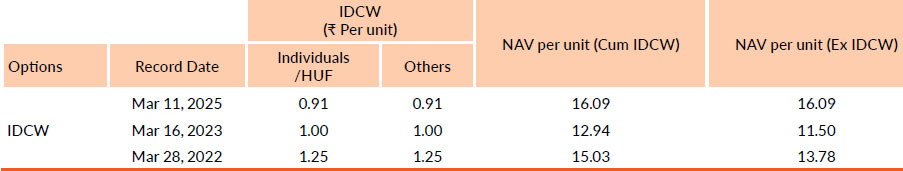 Pursuant to payment of Distribution (of Income & Capital), the NAV of the above stated IDCW options of the scheme/plan would fall to the extent of payout and statutory levy, if any. Past performance may or may not be sustained in future. Face value of units is ₹ 10. IDCW means Income Distribution cum Capital Withdrawal.