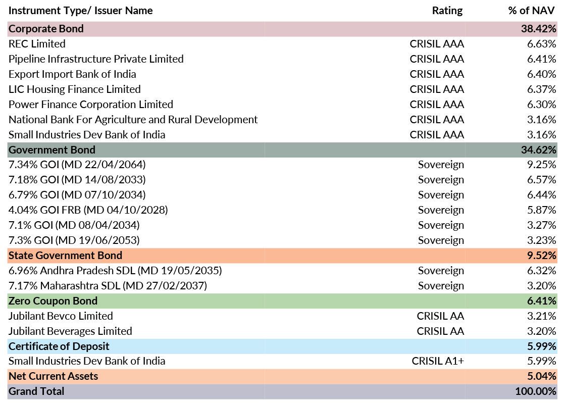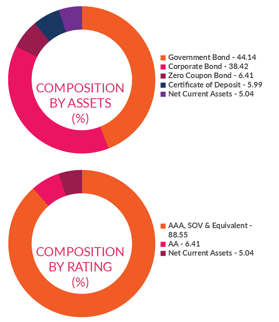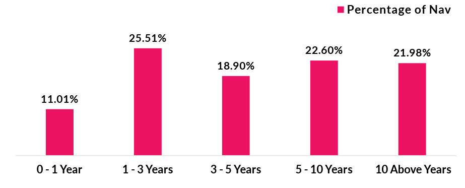 ![]() | Residual Maturity | 8.74 years | Modified Duration* | 4.63 years | Macaulay Duration* | 4.83 years | Annualised Portfolio YTM* | 6.69% | *in case of semi annual YTM, it will be annualised |