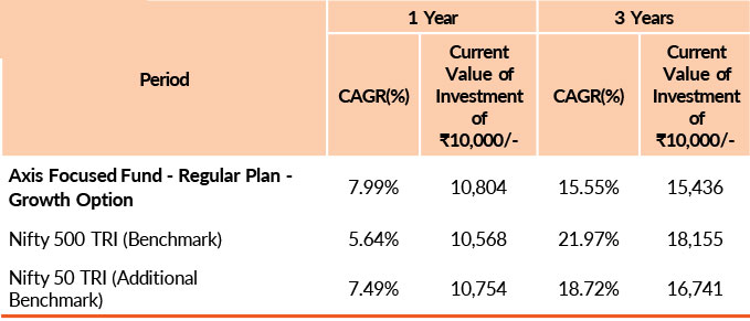 Past performance may or may not be sustained in future.Different plans have different expense structure. Sachin Relekar is managing the scheme since 1st February 2024 and he manages 3 schemes of Axis Mutual Fund & Krishnaa N is managing the scheme since 1st March 2024 and she manages 23 schemes of Axis Mutual Fund .Please refer to annexure for performance of all schemes managed by the fund manager. Returns greater than 1 year period are compounded annualised (CAGR). Face Value per unit : ₹ 10.