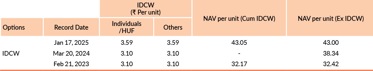 Pursuant to payment of Distribution (of Income & Capital), the NAV of the above stated IDCW options of the scheme/plan would fall to the extent of payout and statutory levy, if any. Past performance may or may not be sustained in future. Face value of units is ₹ 10. IDCW means Income Distribution cum Capital Withdrawal.