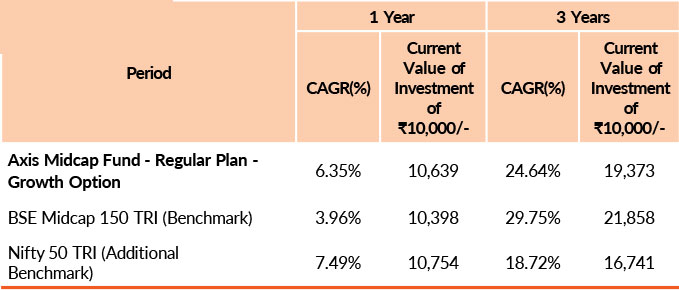 Past performance may or may not be sustained in future.Different plans have different expense structure. Shreyash Devalkar is managing the scheme since 23rd November 2016 and he manages 7 schemes of Axis Mutual Fund & Nitin Arora is managing the scheme since 3rd August 2023 and he manages 4 schemes of Axis Mutual Fund & Krishnaa N is managing the scheme since 1st March 2024 and she manages 23 schemes of Axis Mutual Fund . Please refer to annexure for performance of all schemes managed by the fund manager. Returns greater than 1 year period are compounded annualised (CAGR). Face Value per unit: ₹ 10.