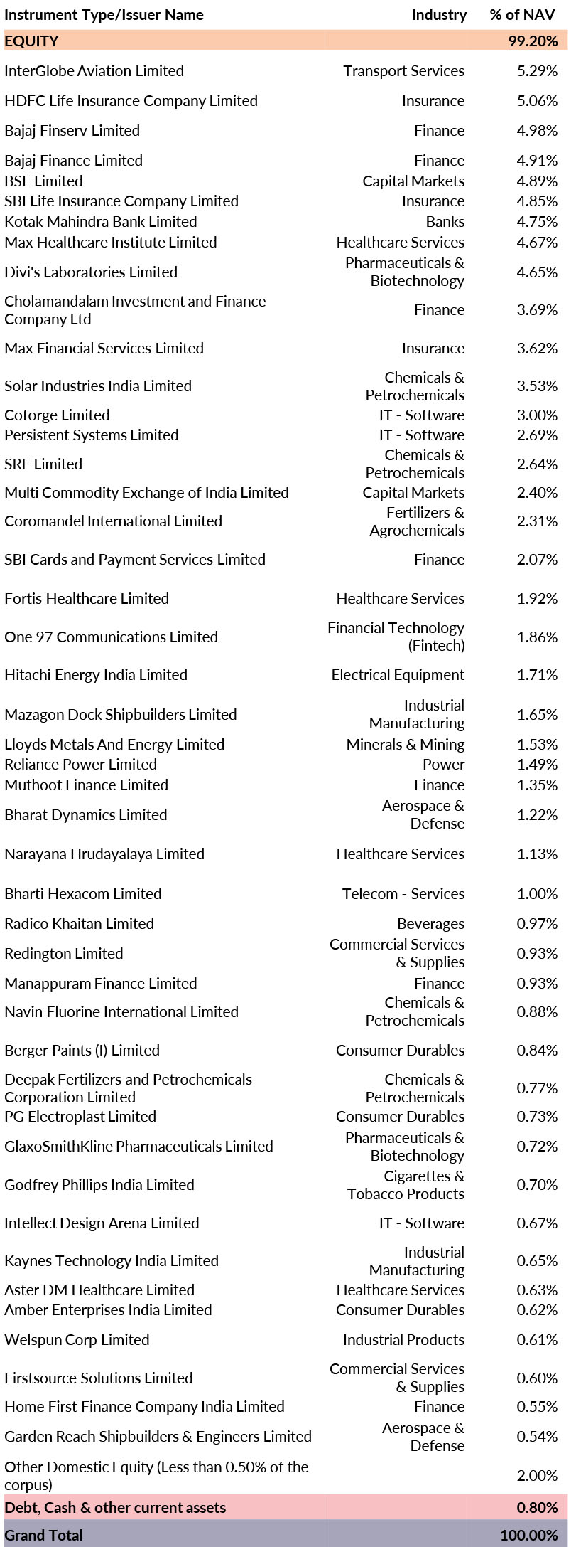 ^^Market caps are defined as per SEBI regulations as below: a. Large Cap: 1st -100th company in terms of full market capitalization. b. Mid Cap: 101st -250th company in terms of full market capitalization. c. Small Cap: 251st company onwards in terms of full market capitalization.