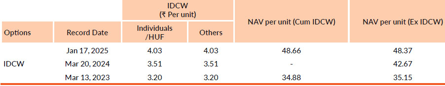 Pursuant to payment of Distribution (of Income & Capital), the NAV of the above stated IDCW options of the scheme/plan would fall to the extent of payout and statutory levy, if any. Past performance may or may not be sustained in future. Face value of units is ₹ 10. IDCW means Income Distribution cum Capital Withdrawal.