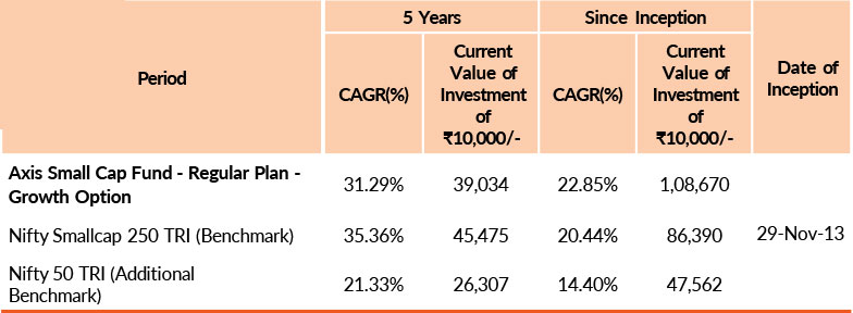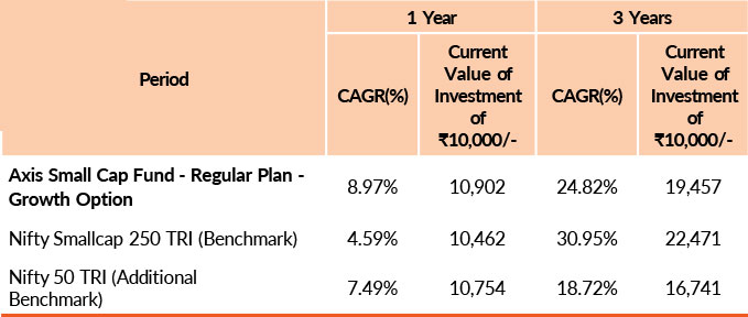 Past performance may or may not be sustained in future.Different plans have different expense structure. Tejas Sheth is managing the scheme since 13th May 2024 and he manages 1 schemes of Axis Mutual Fund & Mayank Hyanki is managing the scheme since 3rd August 2023 and he manages 3 schemes of Axis Mutual Fund & Krishnaa N is managing the scheme since 1st March 2024 and she manages 23 schemes of Axis Mutual Fund . Please refer to annexure for performance of all schemes managed by the fund manager. Returns greater than 1 year period are compounded annualised (CAGR). Face Value per unit : ₹ 10.