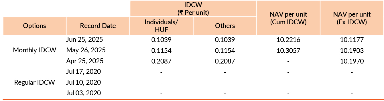 Pursuant to payment of Distribution (of Income & Capital), the NAV of the above stated IDCW options of the scheme/plan would fall to the extent of payout and statutory levy, if any. Past performance may or may not be sustained in future. Face value of units is ₹10. IDCW means Income Distribution cum Capital Withdrawal.