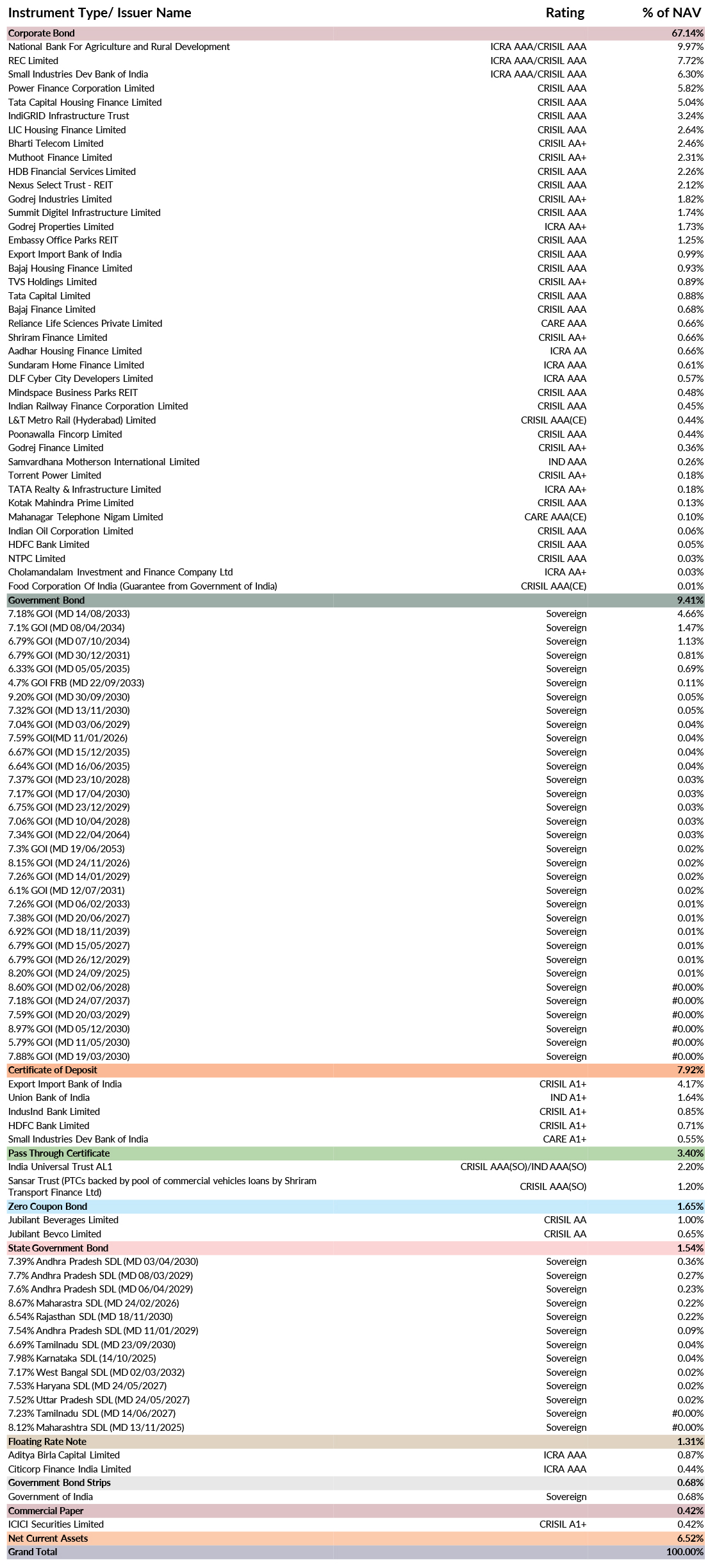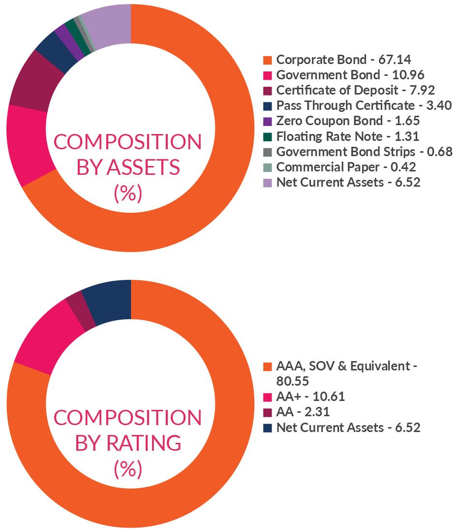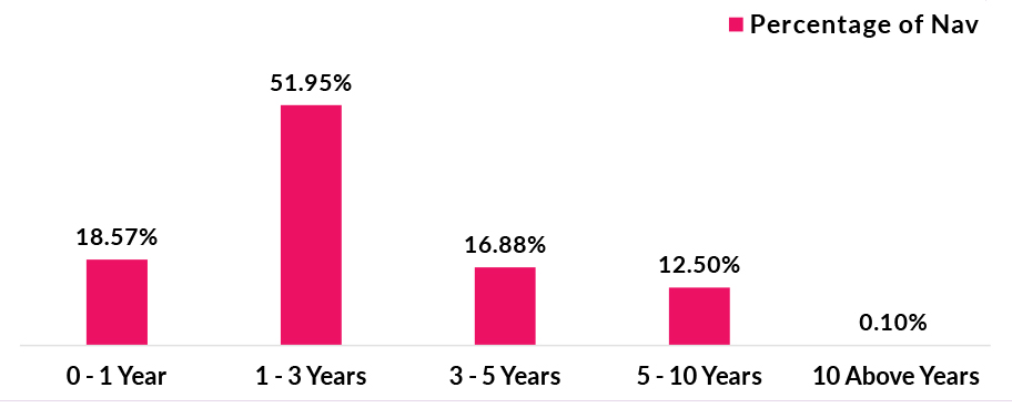 *in case of semi annual YTM, it will be annualised * As per AMFI Best Practices Guidelines Circular No. 88 / 2020 -21-Additional Disclosures in Monthly Factsheets. For instruments with put/call option, the put/call date has been taken as the maturity date. This should not be taken as an indication of the returns that maybe generated by the fund and the securities bought by the fund may or may not be held till their respective maturities. The calculation is based on the invested corpus of the debt portfolio. |