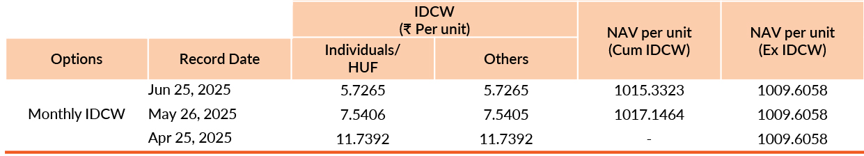 Pursuant to payment of Distribution (of Income & Capital), the NAV of the above stated IDCW options of the scheme/plan would fall to the extent of payout and statutory levy, if any. Past performance may or may not be sustained in future. Face value of units is ₹1000. IDCW means Income Distribution cum Capital Withdrawal.