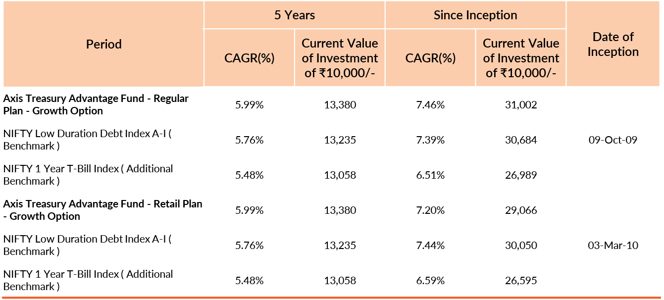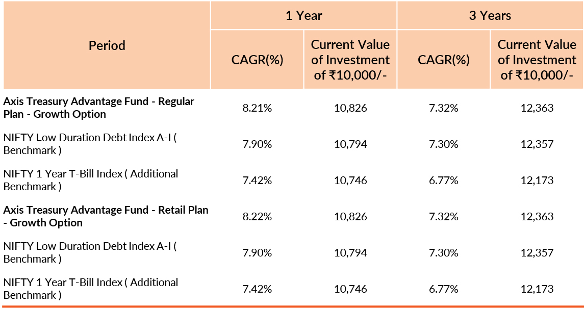 Past performance may or may not be sustained in future. Different plans have different expense structure. Devang Shah is managing the scheme since 7th June 2016 and he manages 21 schemes of Axis Mutual Fund & Aditya Pagaria is managing the scheme since 13th August 2016 and he manages 21 schemes of Axis Mutual Fund . Please refer to annexure for performance of all schemes managed by the fund manager. Returns greater than 1 year period are compounded annualised (CAGR). Face Value per unit : ₹ 1,000.