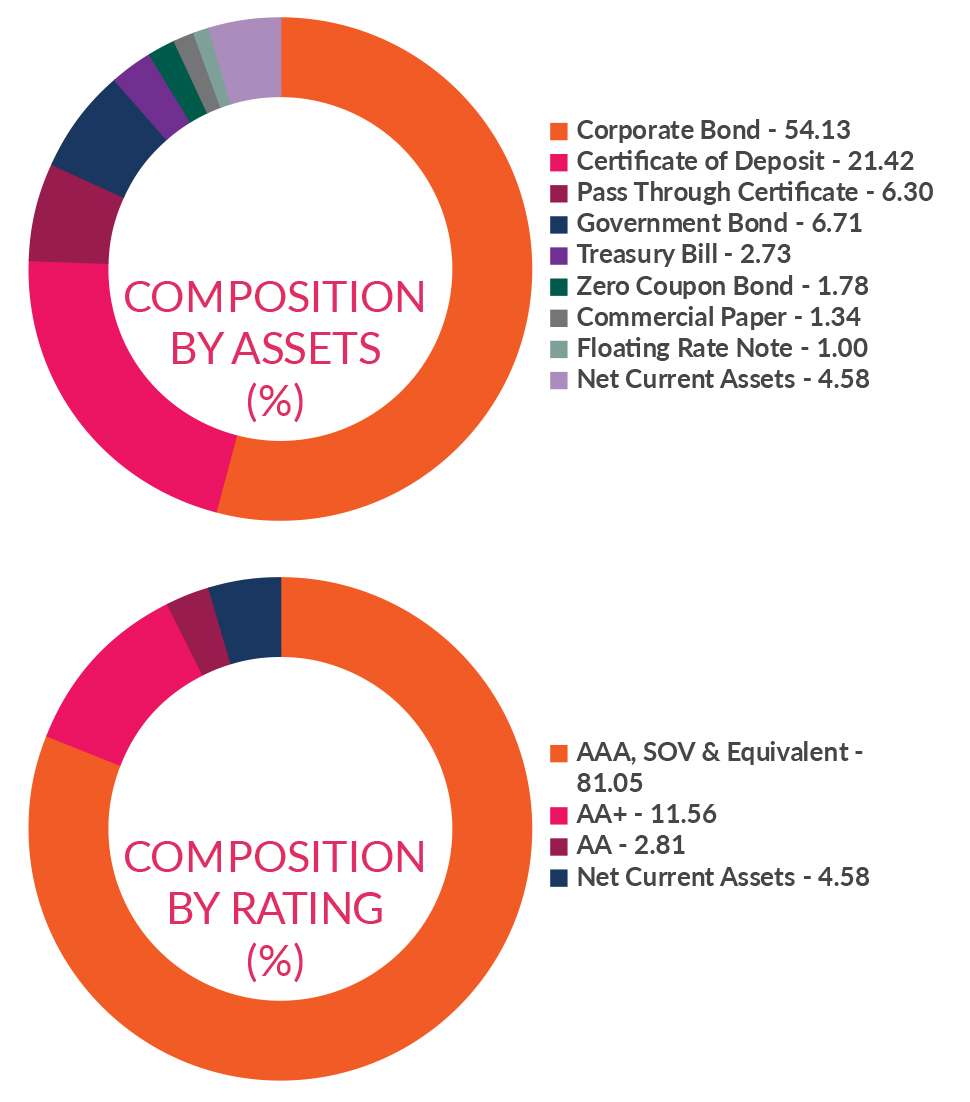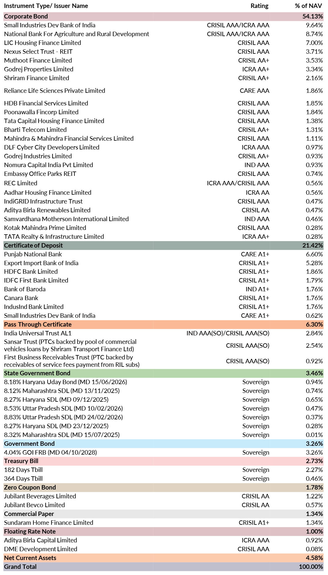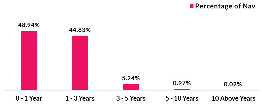![]() | Residual Maturity* | 422 Days | Modified Duration* | 344 Days | Macaulay Duration* | 365 days | Annualised Portfolio YTM* | 6.68% | *in case of semi annual YTM, it will be annualised |