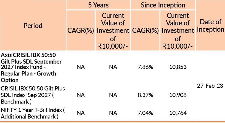 | Axis CRISIL IBX 50:50 Gilt Plus SDL September 2027 Index Fund | 28-Mar-24 | -0.54 | -- | -- | -- | -0.51 |