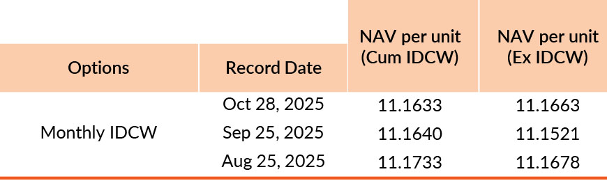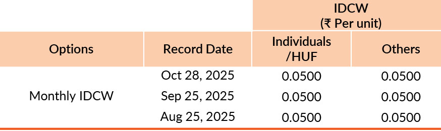 Pursuant to payment of Distribution (of Income & Capital), the NAV of the above stated IDCW options of the scheme/plan would fall to the extent of payout and statutory levy, if any. Past performance may or may not be sustained in future. Face value of units is ₹ 10. IDCW means Income Distribution cum Capital Withdrawal.